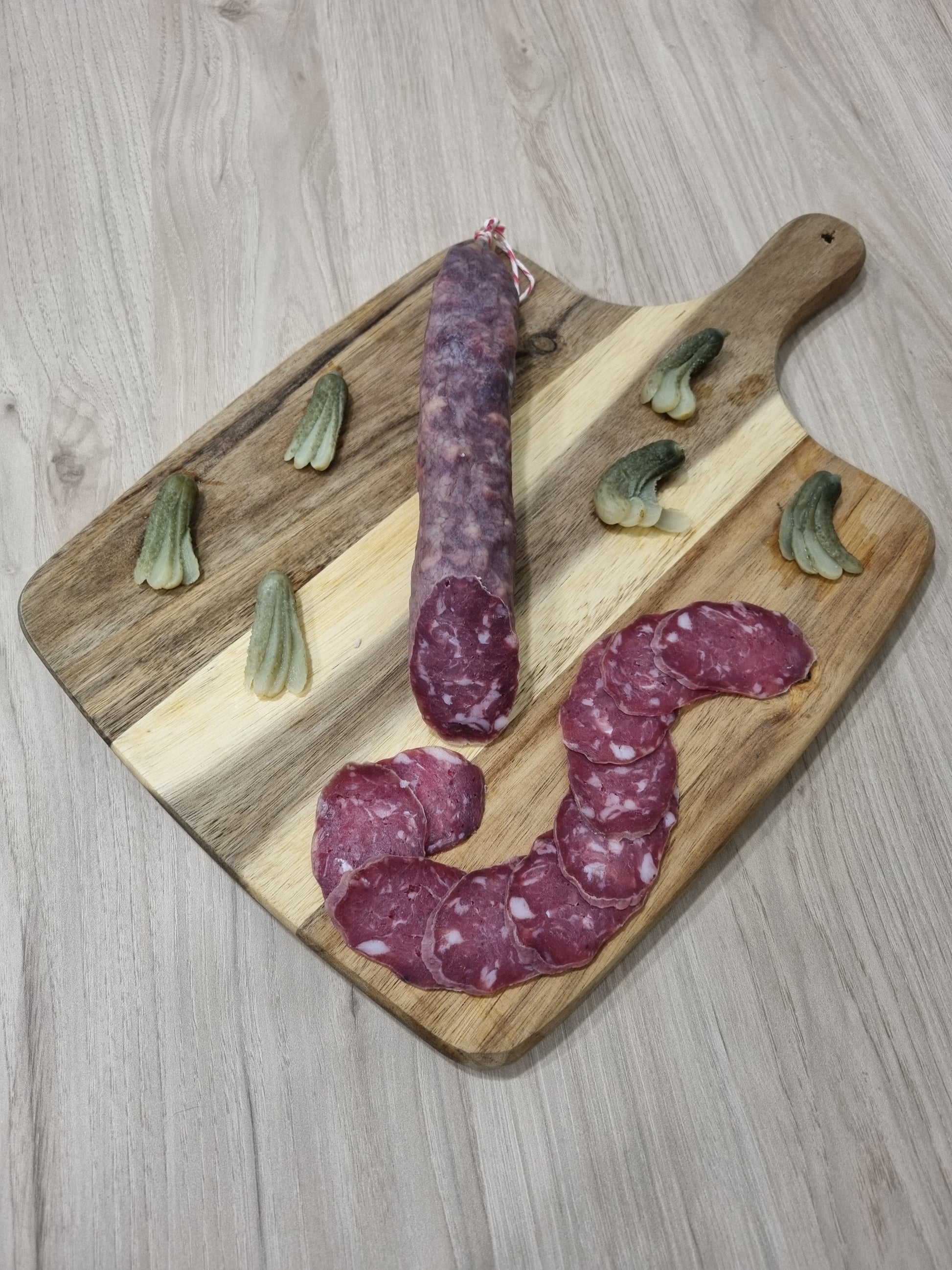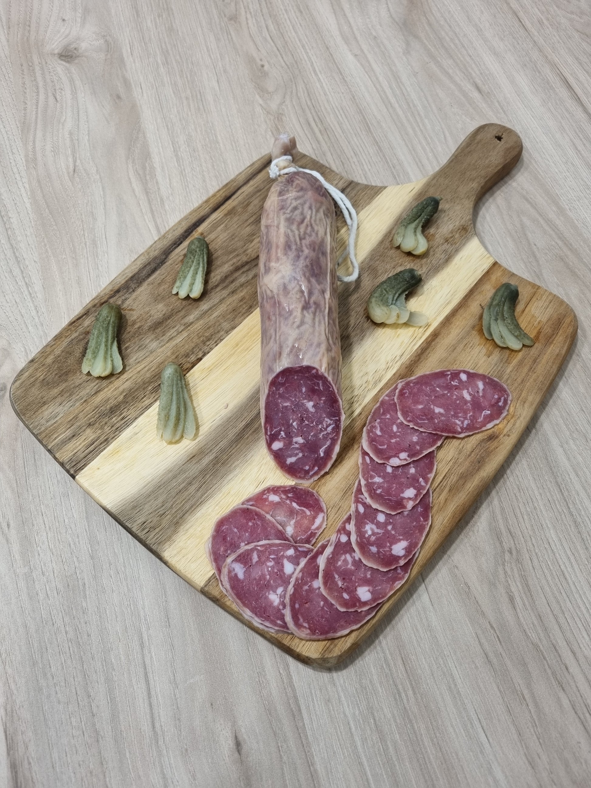 Saucisson sec : viande de porc de l’exploitation, sel, LACTOSE, MOUTARDE, dextrose, sirop de glucose, poivre, ail, acide ascorbique, cumin, extrait de levure, macis, muscade, nitrate de potassium, girofle.