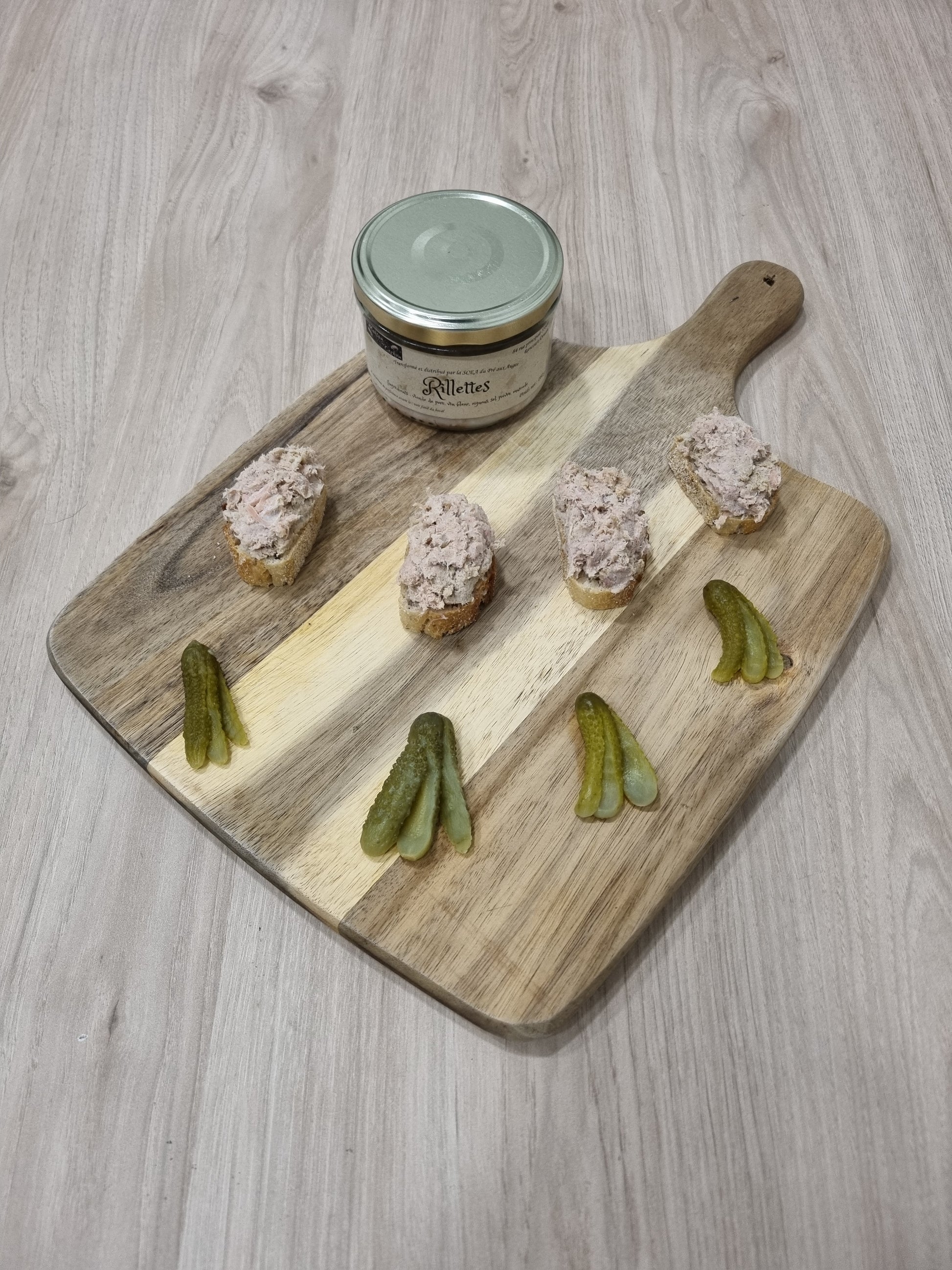 Rillettes : viande de porc de l’exploitation, vin blanc, oignon, sel, poivre, muscade, laurier.